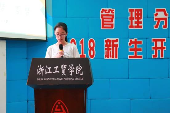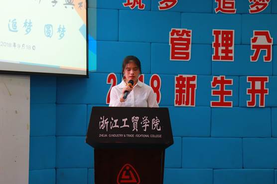 随后会计1601班王丽英代表老生发言,分享了这两年的收获,从学习是大学之本、目标是大学之基、取舍是大学之石三个方面为我们讲解她缤纷多彩的老员工活,并告诫大家:大学是用来珍惜的,不是用来惋惜的;今天的懈怠与纵容,可能直接影响今后的人生。并希望他们在公司能努力学习充分把握学习时机,规划好自己的人生,树立远大的思想和奋斗目标,在这三年里为自己将来的人生之路打下坚实的基础。要坚信我们的未来不是梦。来自金融1803班彭诗倚的新生代表为我们叙述她大学的目标。她从适应老员工活、与同学共同营造团结友爱的氛围、好好学习并坚持学习、努力提高自己的实践能力以及严于律己,树立规范意识五个方面展现了她对大学的期待,也表现了她对未来生活的美好祝愿。