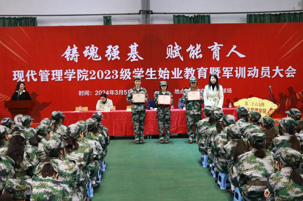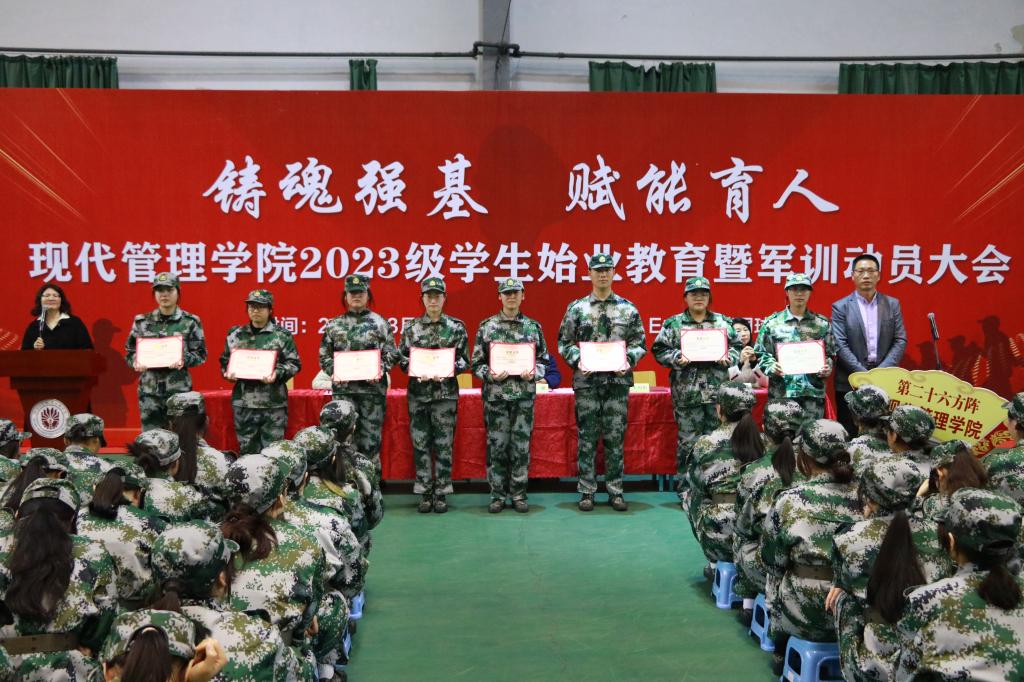 大会进入第四项议程。由2023级军训员工代表会计2307班石梦圆同学带领全体军训员工宣誓,并由体管2301姚晓春同学带领全体教官对本次军训宣誓表态。气势磅礴的声音代表坚定的信念,紧握的右手代表必胜的决心。