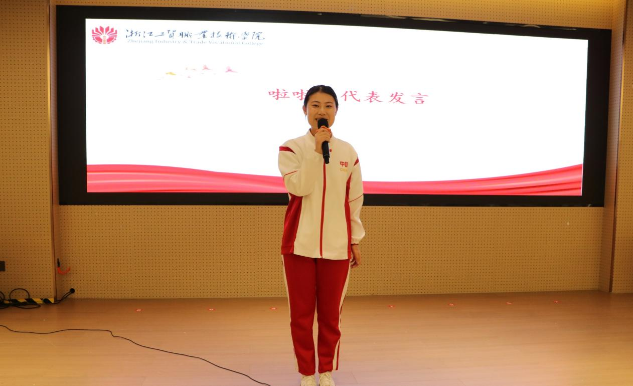 随后,由拉拉队队员代表谢聪玉同学发言,她表示拉拉队将永远站在运动员们的背后,对运动员们给予坚定支持,祝愿运动员们赛出风采,赛出水平。
