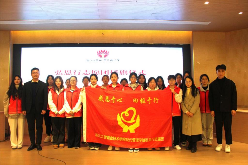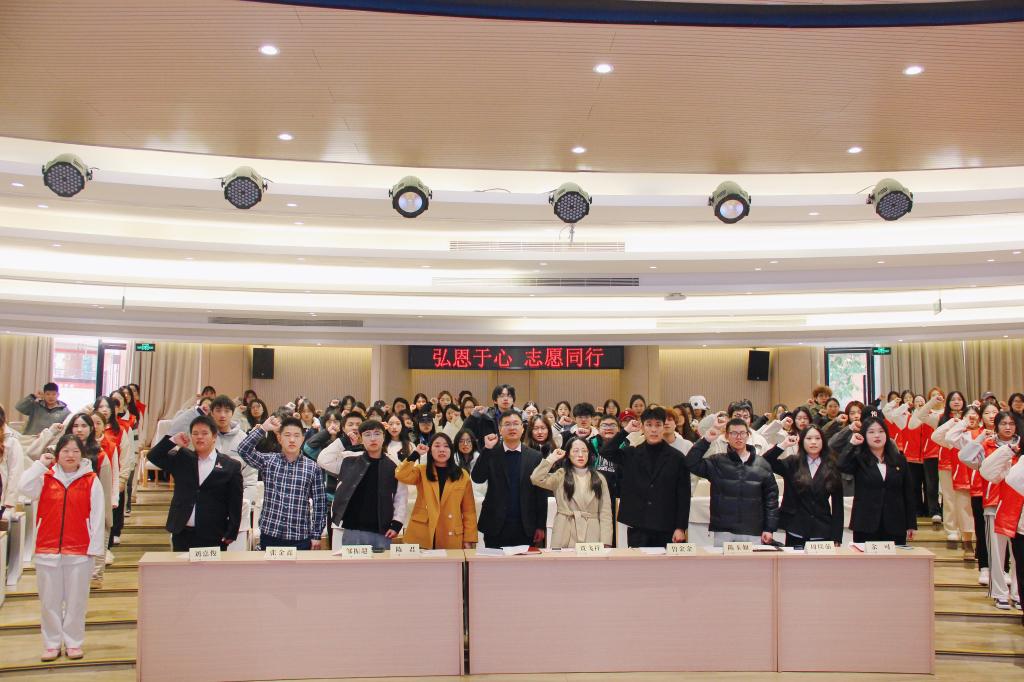 最后,邵超群老师将弘恩行旗传递给第16届志愿团团长金照雯,新团队将继续秉持奉献、友爱、互助、进步的精神,开拓创新,续写志愿服务新篇章。同时,现代管理公司发起青春红苔“志愿 18+”倡议,倡导同学们每学期完成18小时以上志愿工时,秉持“奉献、友爱”的精神服务社会。优秀志愿者代表周文杰同学带领全体志愿者庄严宣誓,响亮誓言彰显着志愿者们的蓬勃朝气与奉献决心。