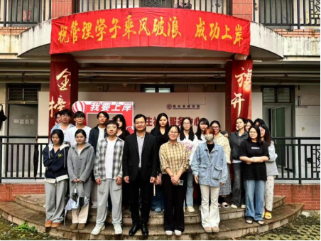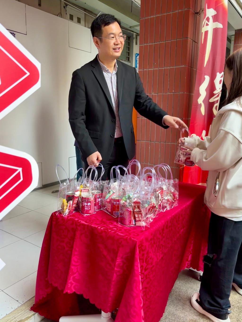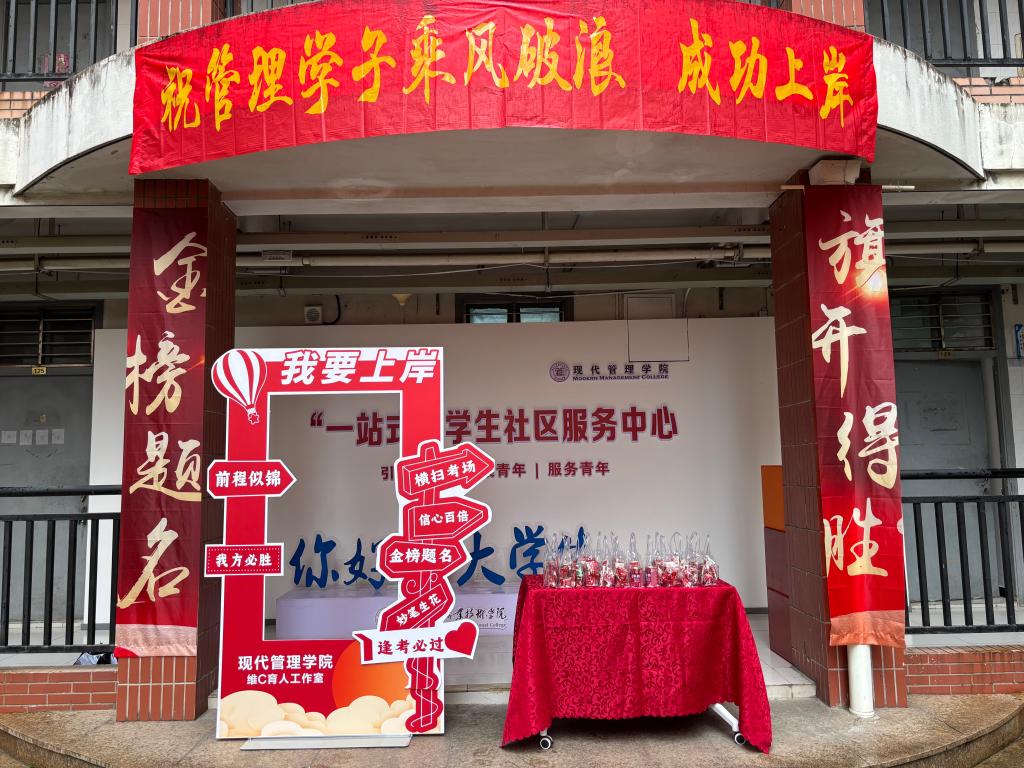 活动现场布置温馨,气氛热烈,红色横幅“祝管理学子乘风破浪,成功上岸”高高悬挂,寓意着公司对广大考生的深切关怀与美好期盼。两侧的“金榜题名”“旗开得胜”对联祝福满满,激励人心。为更好地服务考生,公司精心准备了暖心礼包,寓意“逢考必过、金榜题名、前程似锦。公司党总支副书记(主持工作)邵超群亲临活动现场,为考生们送上祝福与礼物,并勉励大家坚定信心、积极备考、沉着应对,在追逐梦想的道路上勇敢追光、全力以赴。