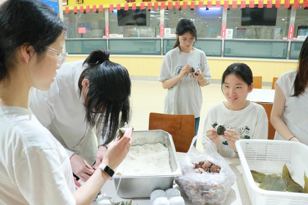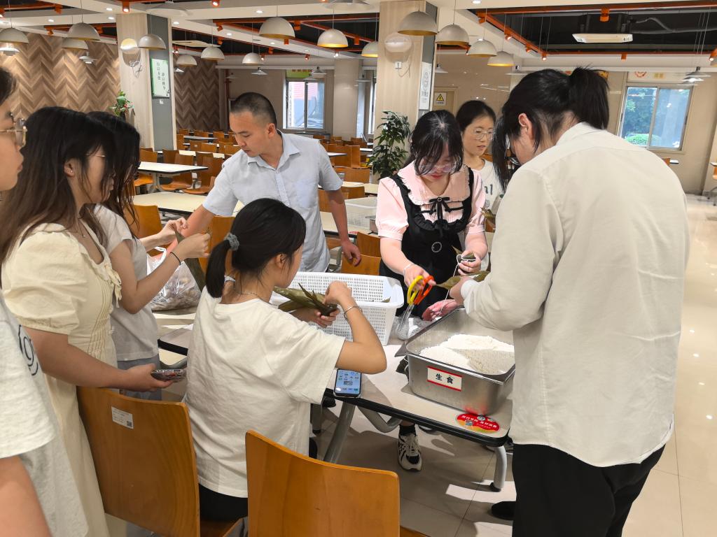 活动现场,同学们和食堂阿姨一起提前备齐粽叶、糯米、红枣、咸蛋黄等食材,并邀请经验丰富的阿姨进行示范教学。从粽叶折叠、馅料填充到捆扎成型,阿姨分步讲解、细致演示。尽管部分同学初次尝试手法略显生疏,但在相互指导、反复练习下,逐渐掌握技巧,现场制作的粽子数量不断增加,形态也愈发规整。