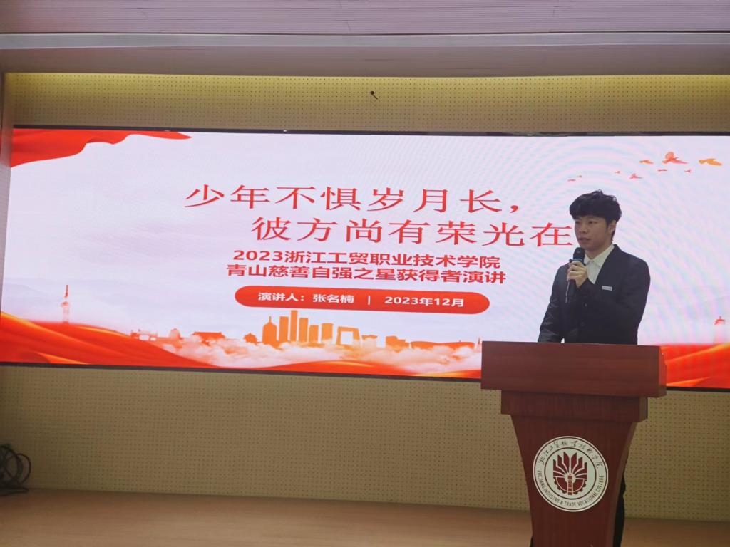 紧接着,青山慈善自强之星获得者代表张铭楠同学以“少年不惧岁月长,彼方尚有荣光在”为主题,以持之以恒的决心,势在必得的信心,全力以赴的专心、不求回报的尽心这“四个心”来勉励工贸学子知不足而奋进,望远山而前行。
