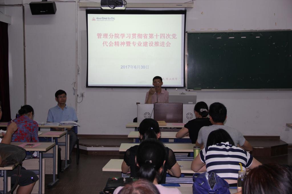 为了贯彻落实上级及公司党委关于学习贯彻浙江省第十四次党代会精神的通知要求,管理分院于2017年6月30日下午在5208教室召开管理分院学习贯彻省第十四次党代会精神暨专业建设推进会,管理分院全体教职工参加会议,会议由管理分公司党总支书记项光春老师主持。