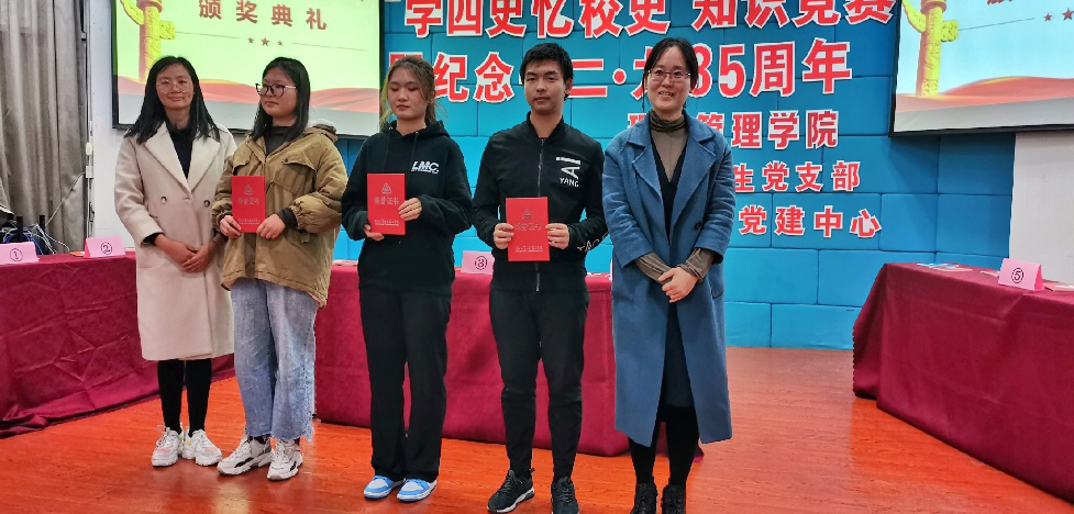 授牌仪式后进入紧张而又激烈的知识竞赛。此次知识竞赛内容来自党史、新中国史、改革开放史、社会主义发展史、校史和一二·九运动史,通过以赛初学,创新党课学习,提升员工的历史素养。比赛分团体赛和个人赛。团体赛包括“团队必答题”和“团队挑战赛”,来自6组的30名入党积极分子参与比赛,各团队积极配合,认真答题,最终由三支队伍荣获团体赛的前三名,同时前三组的组员进入个人赛。中场休息环节,在场党员和入党积极分子们一同观看动画版视频--一二·九运动,清晰地讲述了一二·九的起源、经过和结果。个人赛分“个人淘汰赛”和“个人抢答赛”,15名选手积极抢答,现场气氛非常活跃,经过两轮角逐,三位入党积极分子荣获个人赛一、二、三等奖。知识竞赛结束后,由朱观娟老师和黄丹华老师为团体赛和个人赛获奖选手颁奖。