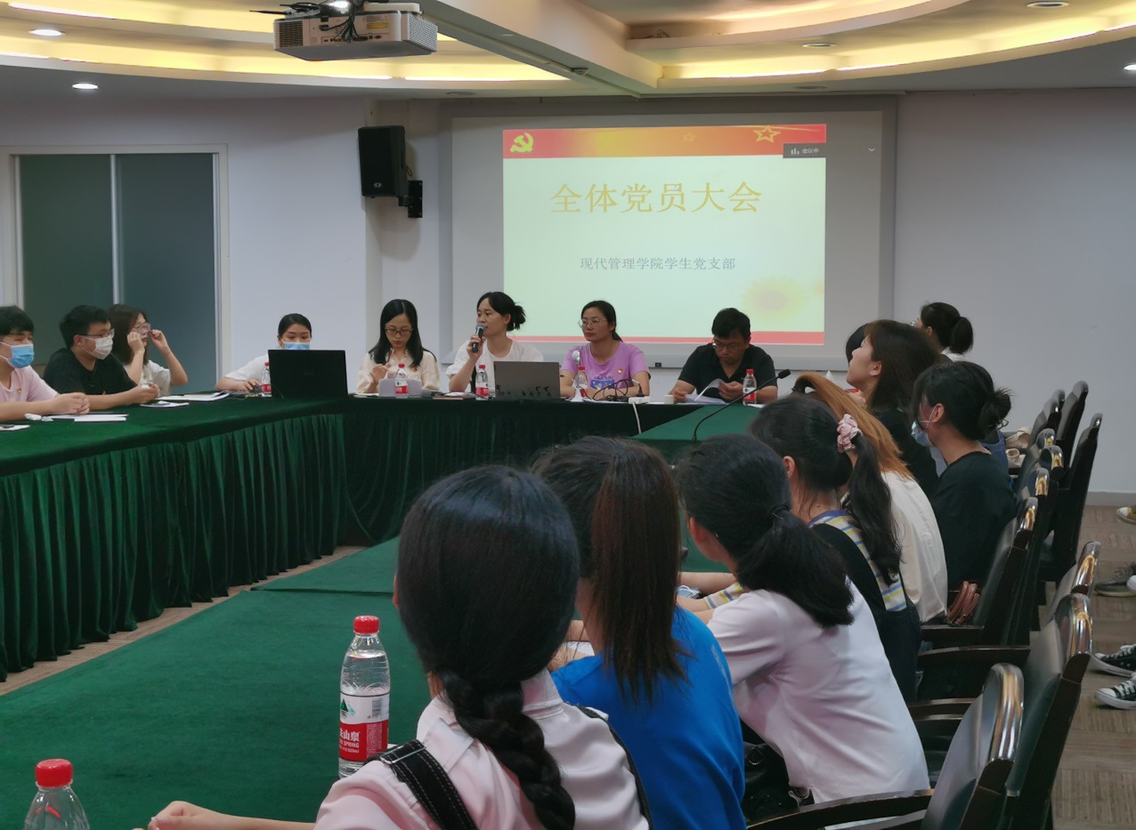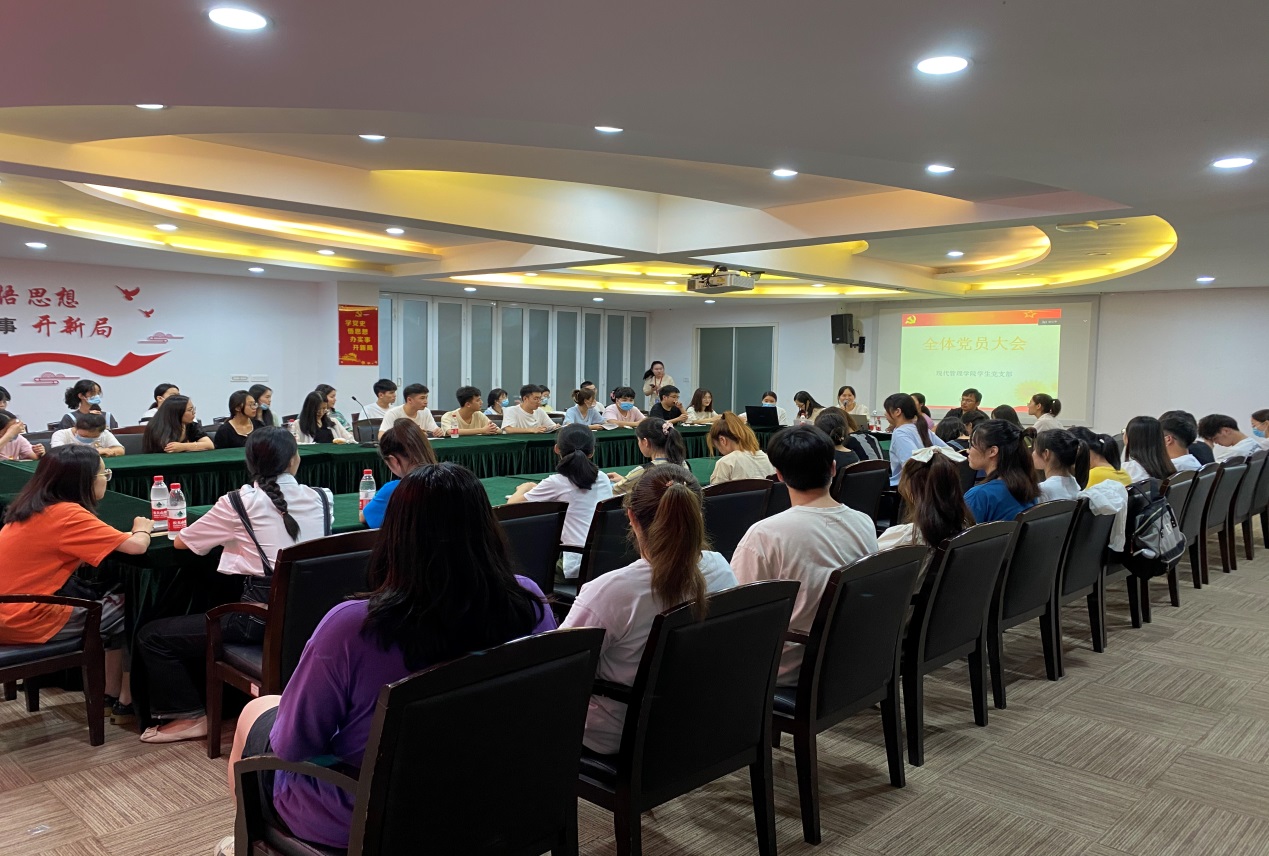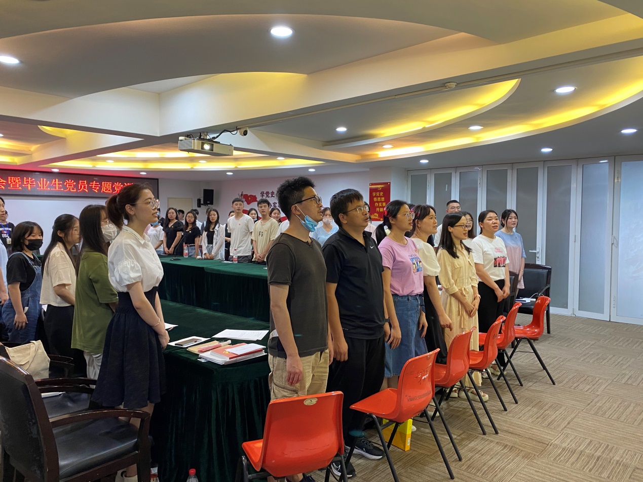 会议主要有五项议程。会议开始,全体与会人员起立并奏唱国歌。会议第二项议程为开展党员转正大会。经过党支部一年的培养与考察,会议按照转正会议流程,讨论陈梓霞等17位同志的转正问题。首先各毕业生党员依次向支部汇报预备期的情况。接着,由各培养人分别介绍预备党员在预备期的表现情况,表明对党员的认可和肯定。随后,由支部成员对毕业生党员能否正式入党进行充分讨论,他们肯定了毕业生党员三年以来的成就与收获,希望毕业生党员能严格遵守《党章》,严格要求自己。通过无记名投票,员工党支部有投票权的党员一致同意陈梓霞等17名同志正式成为中国共产党党员。黄丹华老师宣读了支部大会决议,同时对各毕业生党员给予深切的希望,希望能够继续钻研学习党的理论知识,提高自身实践能力水平,切实发挥党员表率作用。而后,进行第三项议程——庄严的入党宣誓仪式,党员同志们铿锵有力的宣誓声回荡在会议室中。