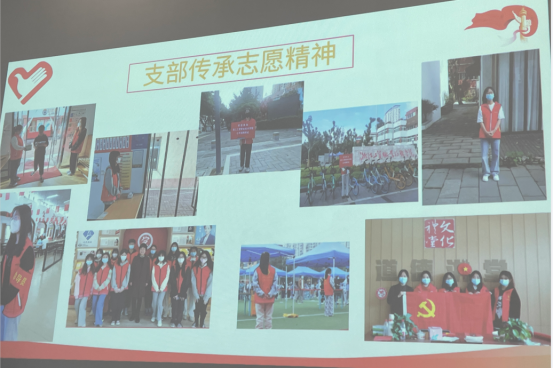 一首歌曲《奉献的青春》拉开了主题党日活动的序幕。这是一首由共青团浙江省委、浙江省志愿者协会共同出品的浙江青年志愿者主题歌。歌曲描绘了浙江省青年志愿者们青春阳光、积极向上的精神风貌和青春靓丽的志愿风采。而后黄丹华老师与全体党员分享了支部成员的志愿风采,他们活跃在文化礼堂、核酸检测、教师招聘、餐厅劝导员和防疫工作中。
