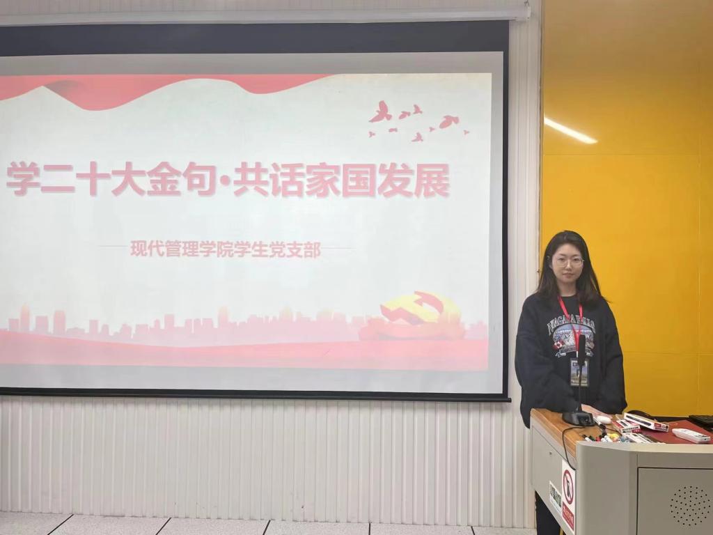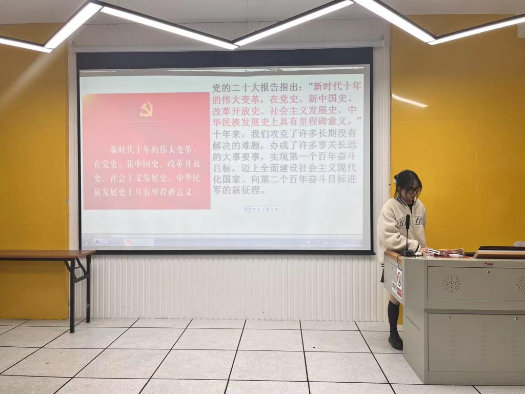 活动分为四个部分。第一部分是“看十年发展,感家国情怀”。入党积极分子们通过观看视频感受新时代的伟大成就,感受党和人民一路奋斗出来的美好生活。大家也一同学习党的二十大报告中的重要话语,认真领悟会议精神。而后每位入党积极分子分享自己最喜欢的二十大金句,畅谈过去十年在党的带领下,家乡所产生的发展和改变,培养民族自豪感。
