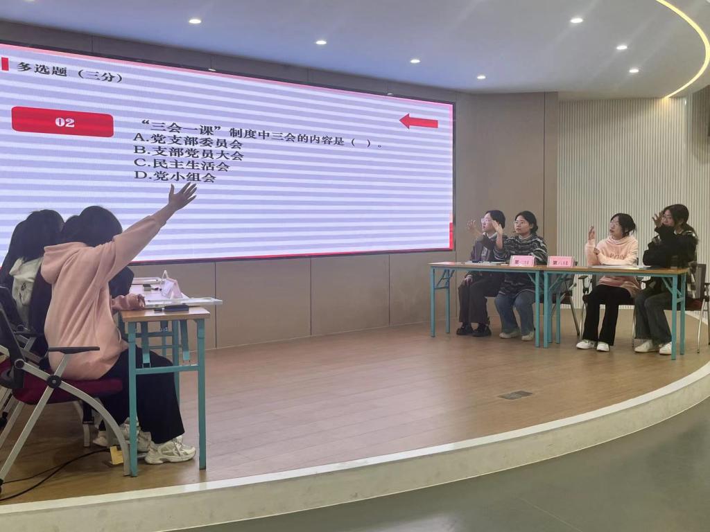 2022年11月底,188名2021级入党积极分子通过线上答题参与党史知识竞赛的初赛。经过初选,24名入党积极分子进入决赛,赛制为团体赛。在主持人宣讲比赛规则后,8个小组依次进入比赛的第一轮单选题必答题和第二轮填空题必答题。在两轮比赛中,每组自由选派两位选手应战。选手们认真读题,沉稳作答,正确作答了大部分题目,展现了良好的理论素养。随后是紧张激烈的抢答环节,通过大屏幕呈现不同分值题目,选手们快速亮题抢答题目。此环节战况激烈,选手们积极抢答,现场气氛十分活跃。经过三轮的比赛环节后,在场入党积极分子们观看视频,共同回顾2022年度TapTap点点员工党支部与管理学子们走过的美好历程。