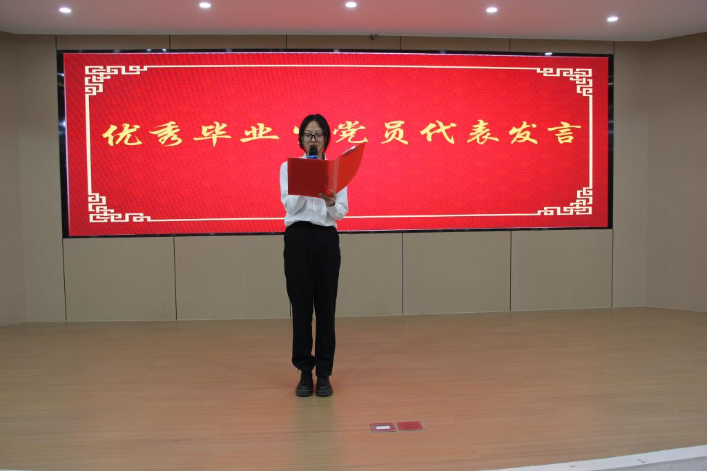 在全体齐唱《国际歌》后,优秀毕业生党员代表会计2003班董莹婕分享她的入党成长之路和她对党的深刻热爱之情。她说党旗所指,吾心所向,她感谢公司和党对个人的培养,也寄语2021级预备党员、2022级入党积极分子,希望每个人都能借青春之光,永葆“赶考”的清醒与坚定,以一片赤诚之心献礼党。