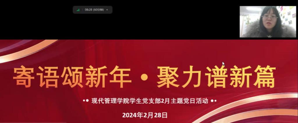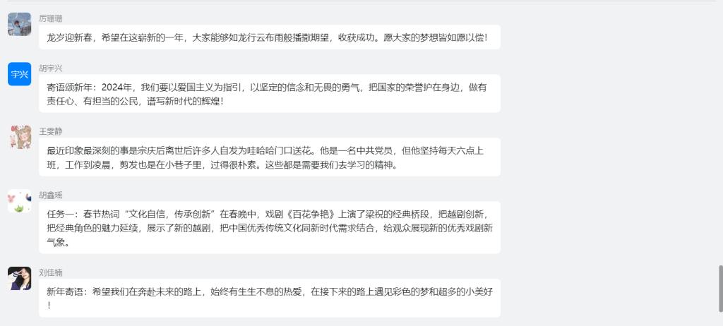 而后,各预备党员围绕“新目标”“新愿望”“新期待”等方面进行交流,分享了2023年印象最深刻的人、事和语句,同时写下2024年对国家,对中国共产党和对党员的新年祝福以及个人新一年的新目标。黄老师也引用2024央视春晚的《如果要写年》歌曲,希望每位党员在新年能用眼睛耳朵、用心,去感受每一个瞬间。