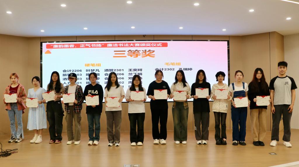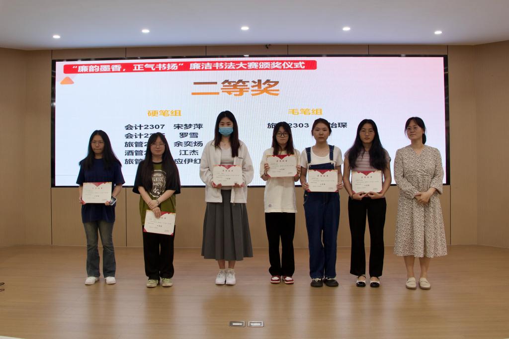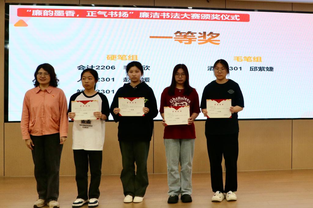 活动最后开展公司的“廉韵墨香,正气书扬”廉洁书写大赛的颁奖仪式,公司副书记朱秀清老师、员工党支部书记黄丹华老师和辅导员鲁金金老师分别颁发一等奖、二等奖、三等奖。