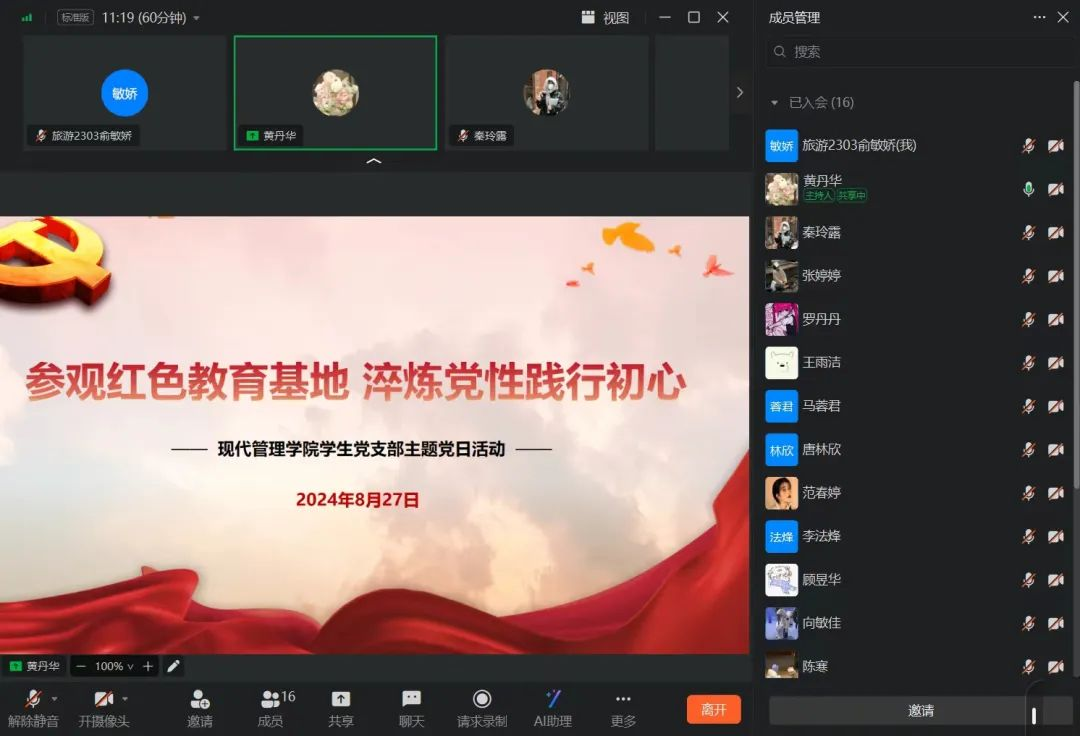 会上,黄老师带着党员们开展第一议题学习。随后,党员们分享了个人走访和参观红色教育基地的所见与所悟。党员们走访了许多红色教育基地,慈溪历史馆、温州革命烈士纪念馆、南京大屠杀纪念博物馆、中共一大纪念馆、抗战时期中共黄岩县委机关旧址、中国工农红军挺进师纪念园、国旗教育馆、长兴新四军苏浙军区旧址群、梅园革命史迹陈列馆都留下了党员的身影。在分享会中,党员们纷纷表示参观红色教育基地,是对一段历史的回顾,能让我们感受炽热的爱国情怀,去铭记那些用生命诠释抗日征程的英勇事迹;是一次革命历史的学习之旅,更是一场心灵的洗礼。通过参加,党员们更加明白眼前的一幕幕胜景,正是革命先辈美好理想的写真,亦是革命先辈浴血奋战、筚路蓝缕所换来的。党员们也表示,青年更要铭记历史,珍惜当下,为建设更加美好的未来而努力。
