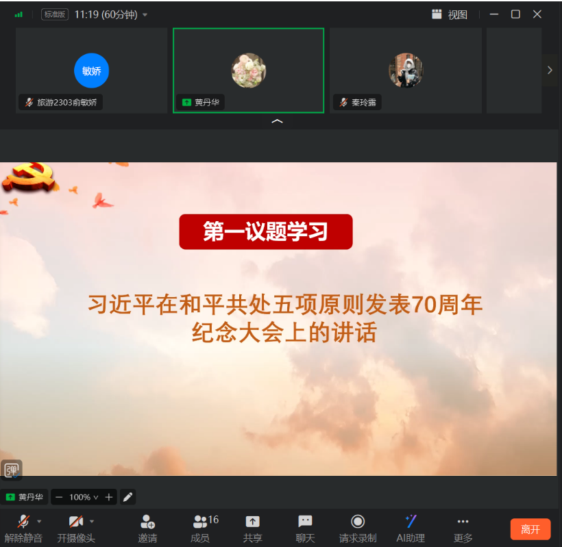 在第一议题学习中,全体党员在黄丹华老师的带领下,学习了习近平在和平共处五项原则发表70周年纪念大会上的讲话。黄老师指出和平共处五项原则的创立是时代的呼唤、历史的选择,更是推动人类文明进步的重要力量。而后,分院员工党支部书记黄丹华老师与党员们观看并学习相关二十届三中全会的视频。学习中,黄老师介绍了二十届三中全会的全称、主要议程、召开时间及地点等基本信息,此次会议是在以中国式现代化全面推进强国建设、民族复兴伟业的关键时期举行的一次重要的会议。黄老师指出我们必须增强改革意识,学深悟透全会精神,深刻领会全面深化改革的重大意义。