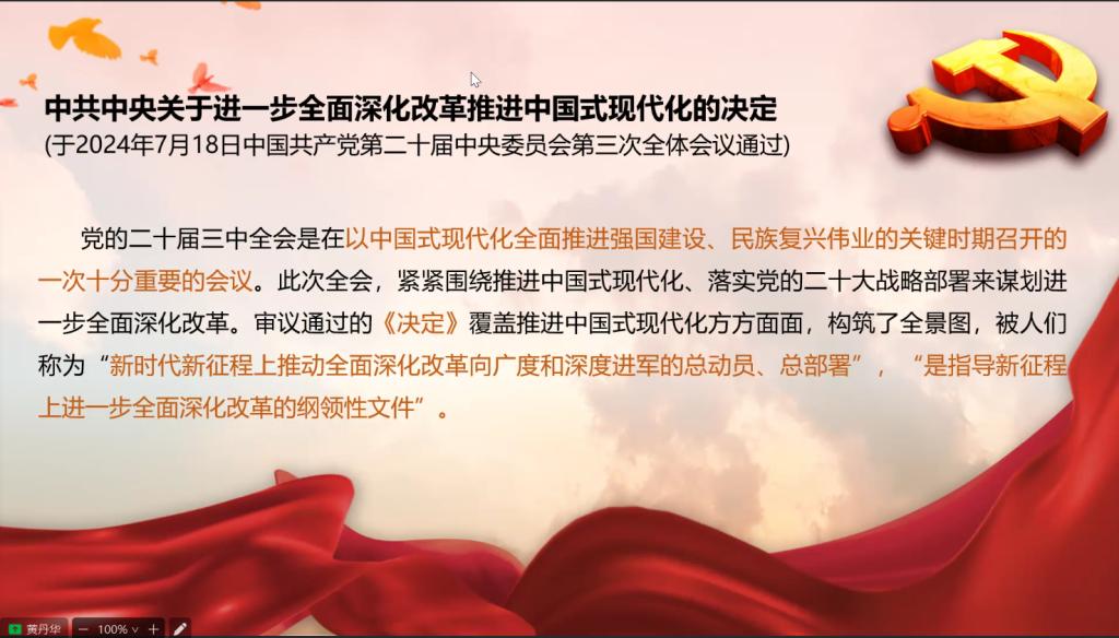 为深入学习贯彻党的二十届三中全会精神,提高党员思想觉悟,2024年7月26日,TapTap点点员工党支部在钉钉上开展关于“学习贯彻党的二十届三中全会精神”主题党日活动,支部党员参加会议,会议由支部书记黄丹华老师主持。